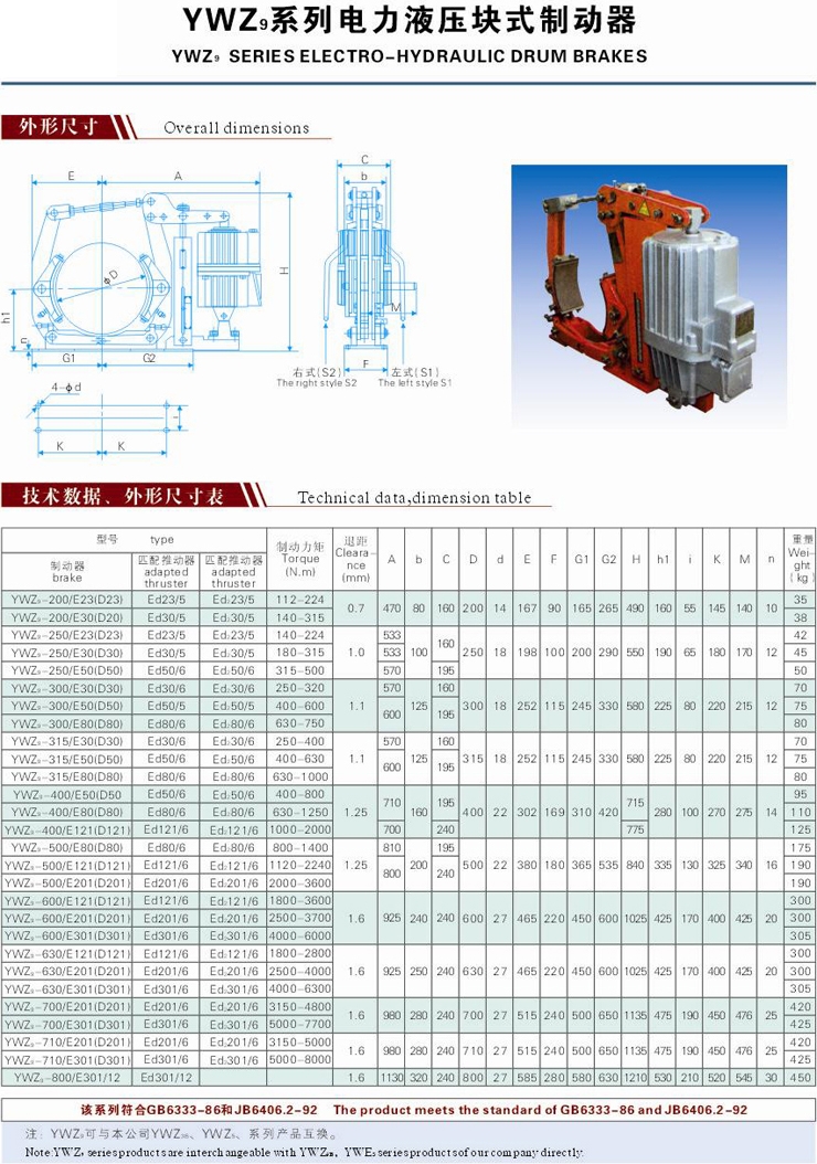 YWZ系列電力液壓塊式制動器安裝尺寸符合JB/T6406.2-1992標準。